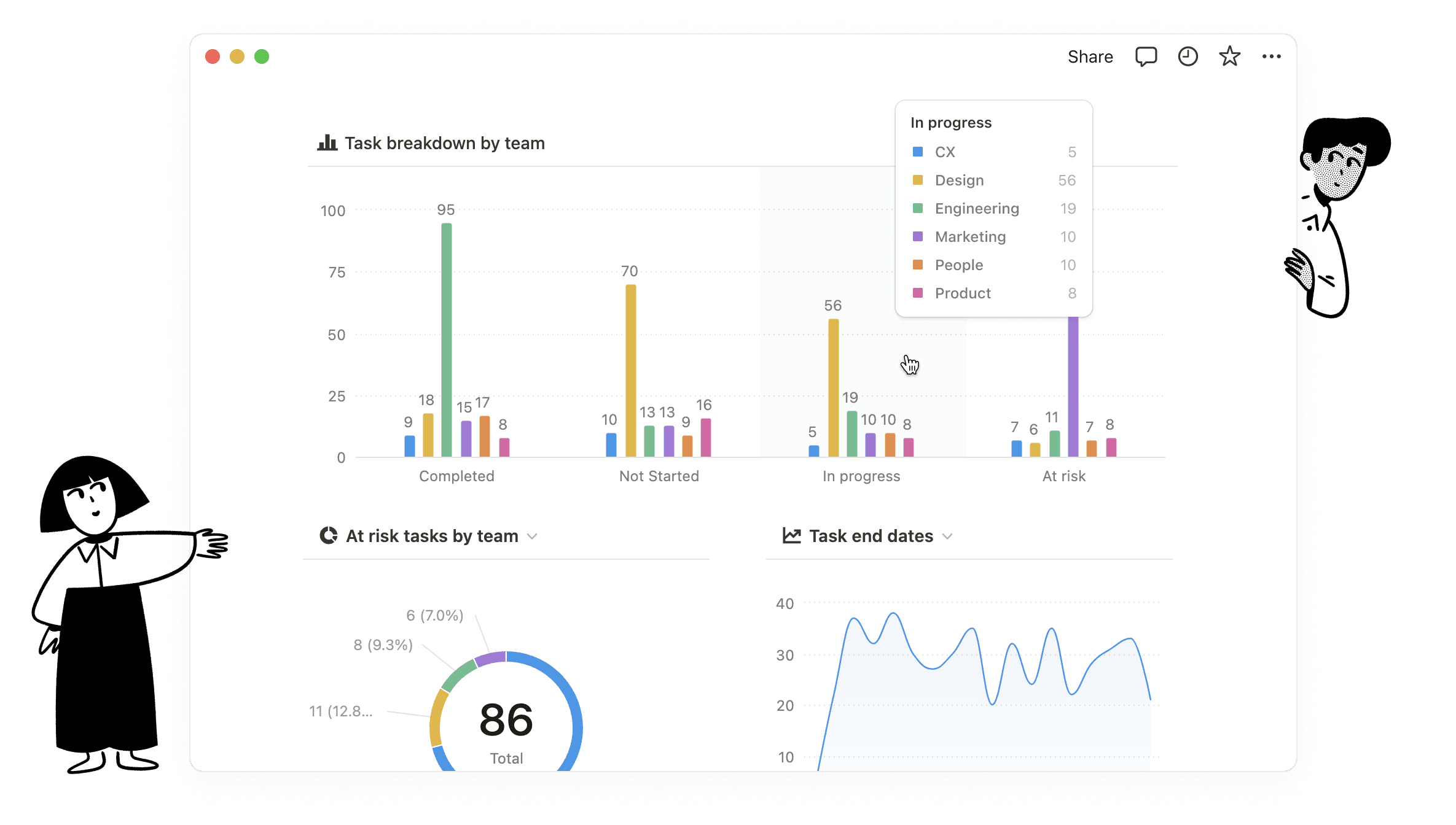 날짜, 팀, 사람 등 원하는 기준에 따라 작업을 시각화할 수 있어요.
